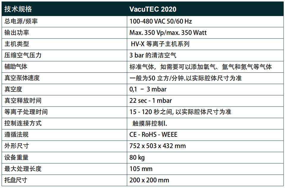 Tantecs VacuTEC 2020Vacuum plasma processing is suitable for the processing of larger injection molding products of different materials. The fast processing speed of this equipment provides the best product surface energy and good combination for the layers, glue, printing, spraying of downstream processes.